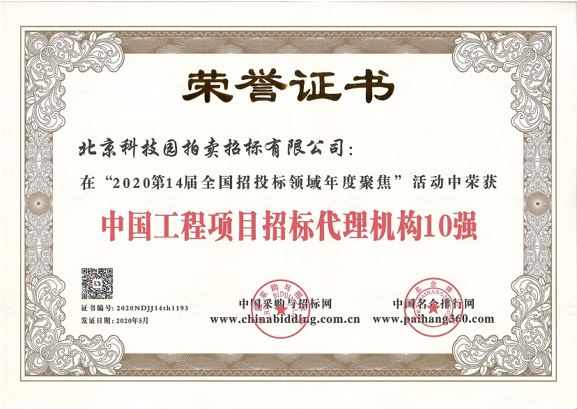 2020第14屆全國招投標領域年度聚焦“中國工程項目招標代理機構10強”