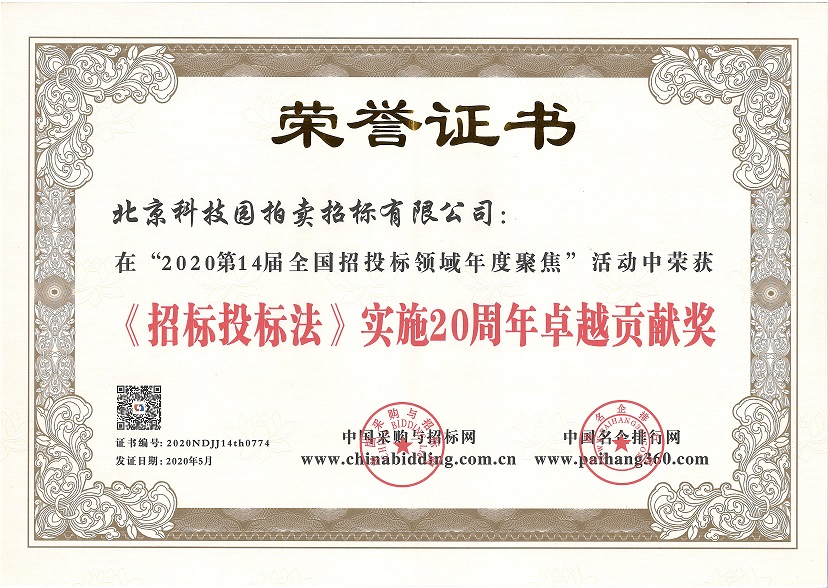 2020第14屆全國招投標領域年度聚焦“《招標投標法》實施20周年卓越貢獻獎”(2020.5)
