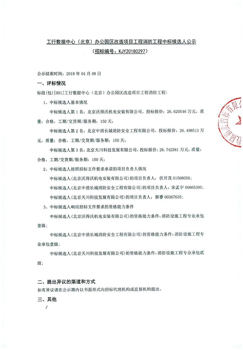 工行數據中心(北京)辦公園區改造項目工程消防工程中標候選人公示